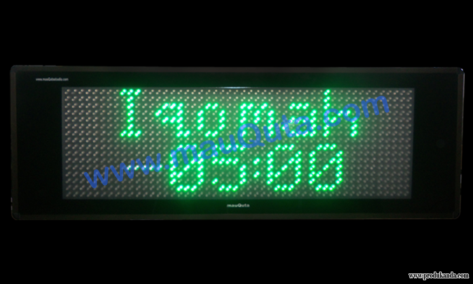 JADWAL SHOLAT JAM ANGKA ARAB IQOMAH COUNTER MQ-12 JA : MENUNJUKKAN  JADWAL WAKTU SHOLAT DENGAN TAMPILAN 2 BARIS (ATAS : JAM, BAWAH : INFOTEXT), BERISIKAN HARI,TANGGAL, JADWAL SHOLAT, DAN INFO (NAMA MASJID, ALAMAT, PESAN - PESAN - MISL: LURUSKAN SHAF, MATIKAN HP DLL) YANG BISA DIPESAN. SETELAH INFOTEXT TERSAMPAIKAN SEMUA DISPALY AKAN FULL MENUNJUKKAN JAM ANGKA ARAB SEKITAR 20 DETIK, KEMUDIAN NORMAL LAGI TAMPILAN 2 BARIS.